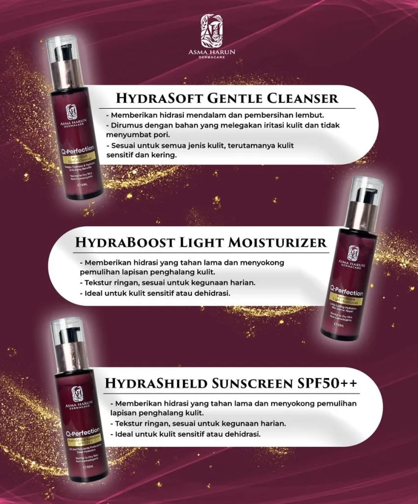 Setiap produk dalam Asma Harun Dermacare direka untuk melengkapi antara satu sama lain – dari pencuci, pelembap, serum hingga ke pelindung matahari – supaya kulit anda mendapat penjagaan menyeluruh.